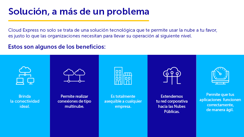 Cloud express es la solución que provee conectividad directa y privada a los principales proveedores de nubes públicas como AWS, Microsoft Azure, Google, Oracle, IBM y 250 nubes más.